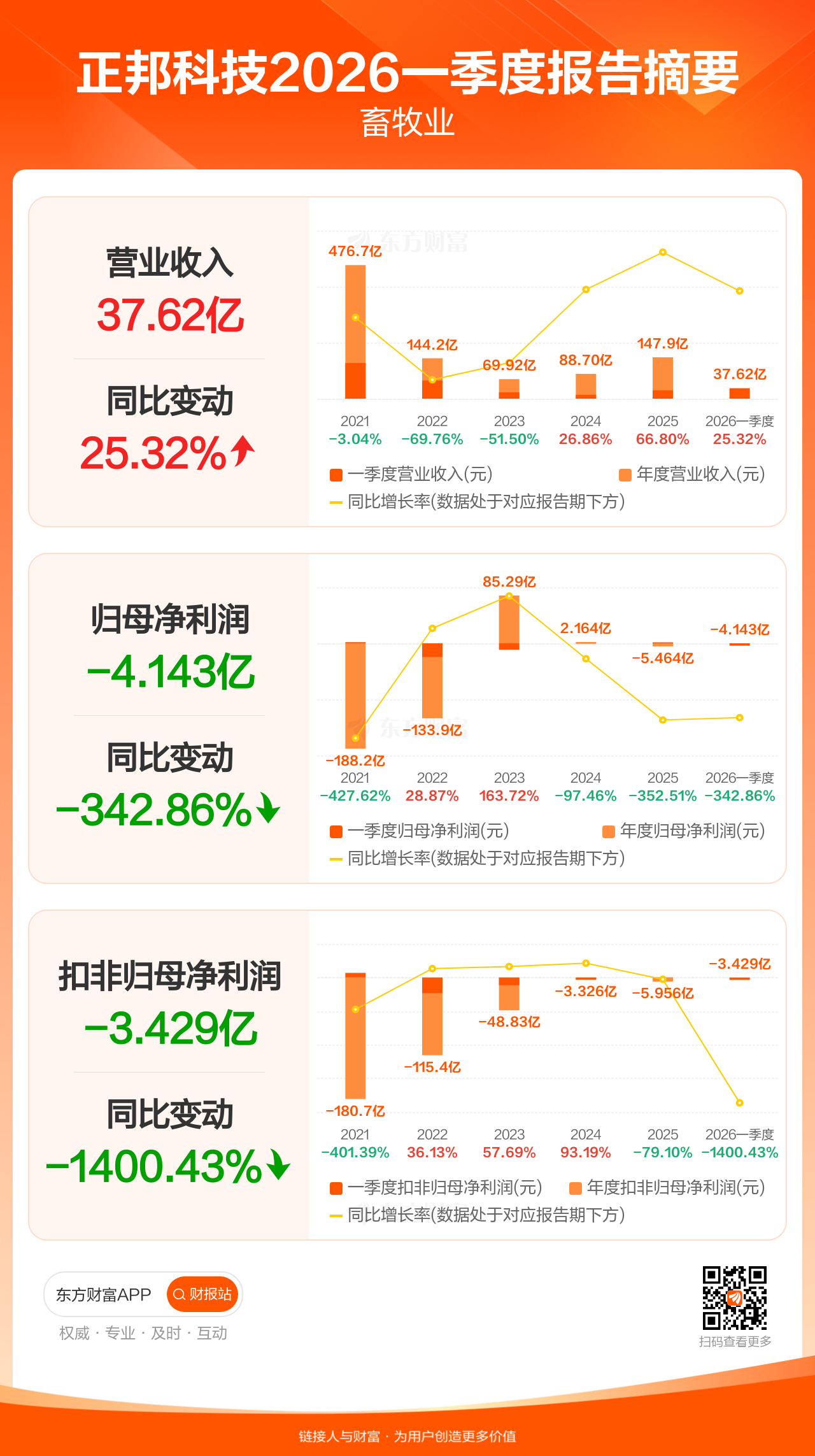 正邦科技4月29日发布2026年一季报显示,公司一季度实现营业收入37.62亿元,同比增长25.32%;归母净利润-4.14亿元;扣非归母净利润-3.43亿元。
