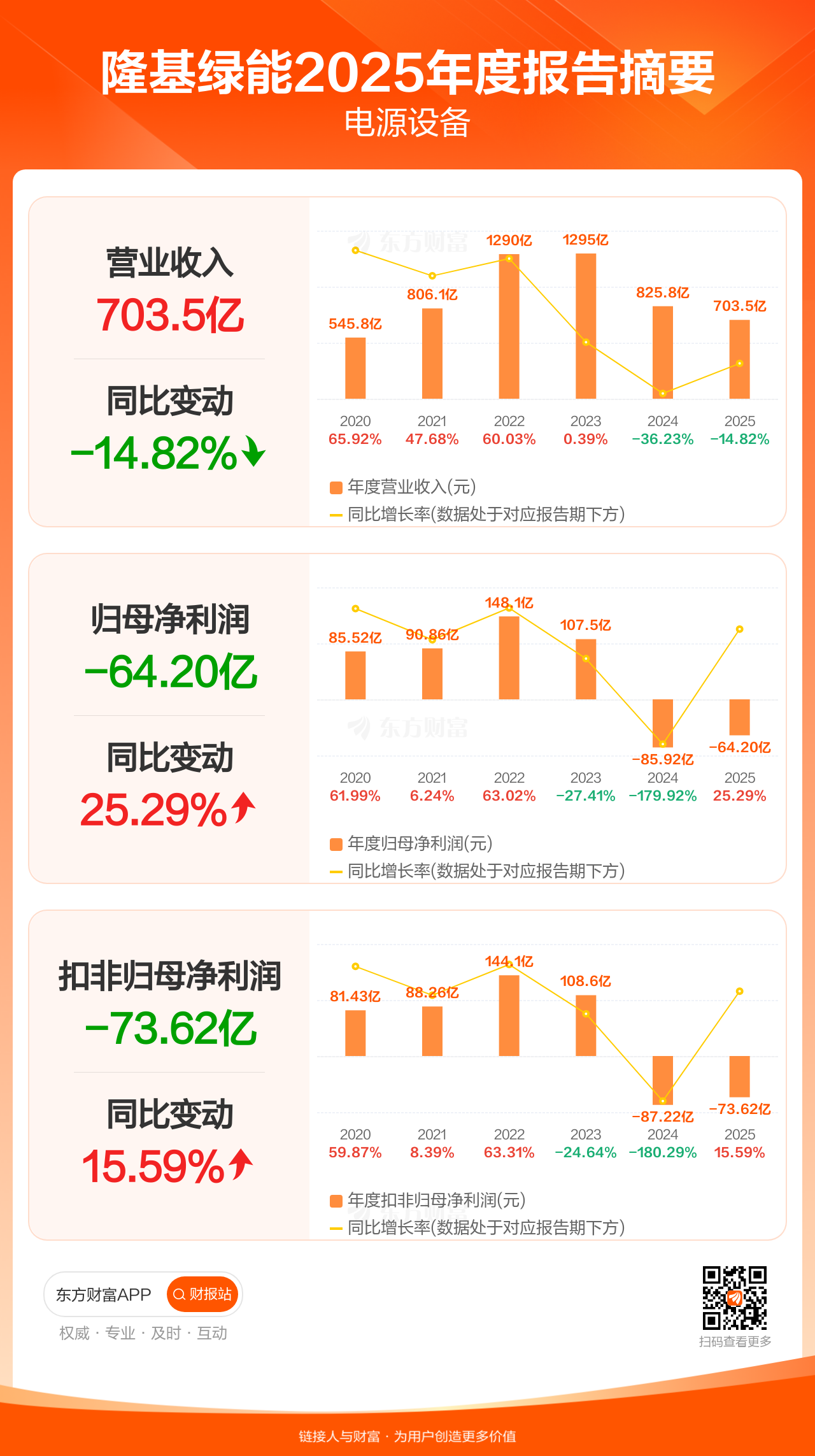 隆基绿能4月29日发布2025年年报显示,公司全年实现营业收入703.47亿元,同比下滑14.82%;归母净利润-64.20亿元;扣非归母净利润-73.62亿元。
