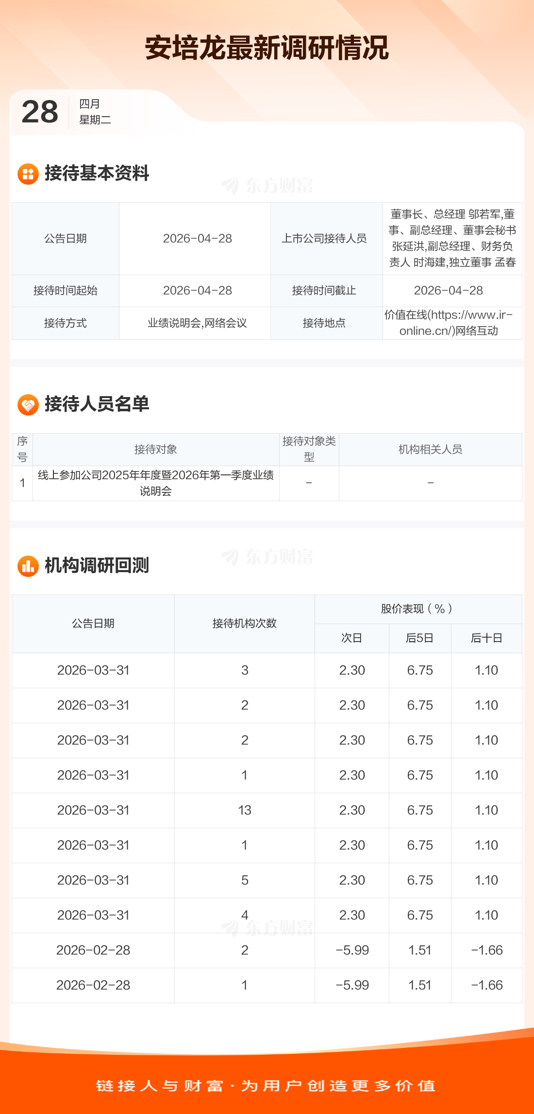 安培龙4月28日公告称,4月28日接待线上参加公司2025年年度暨2026年第一季度业绩说明会调研。接待人员包括董事长、总经理 邬若军,董事、副总经理、董事会秘书 张延洪,副总经理、财务负责人 时海建,独立董事 孟春。