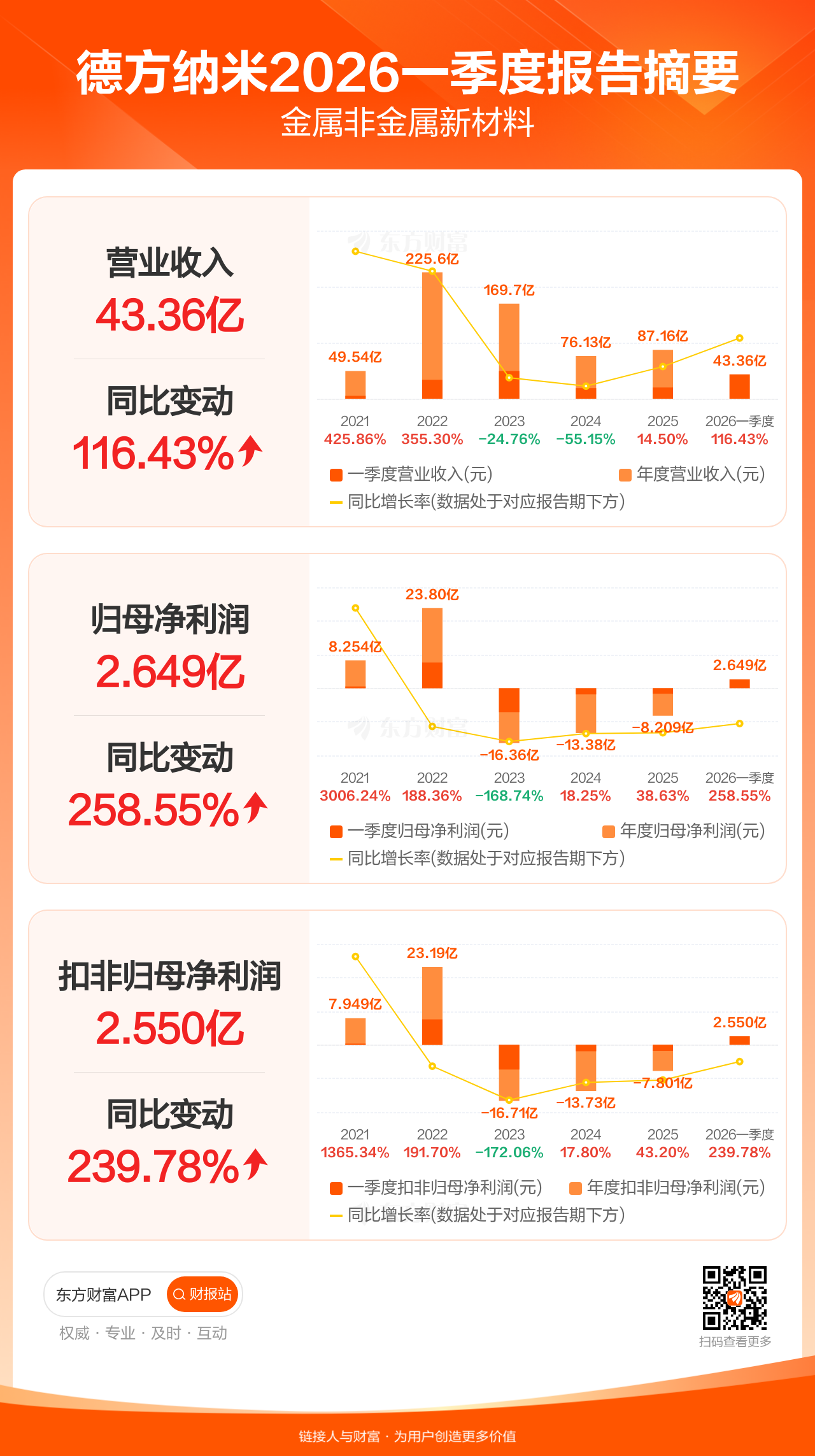 德方纳米4月29日发布2026年一季报显示,公司一季度实现营业收入43.36亿元,同比增长116.43%;归母净利润2.65亿元,同比增长258.55%;扣非归母净利润2.55亿元,同比增长239.78%。