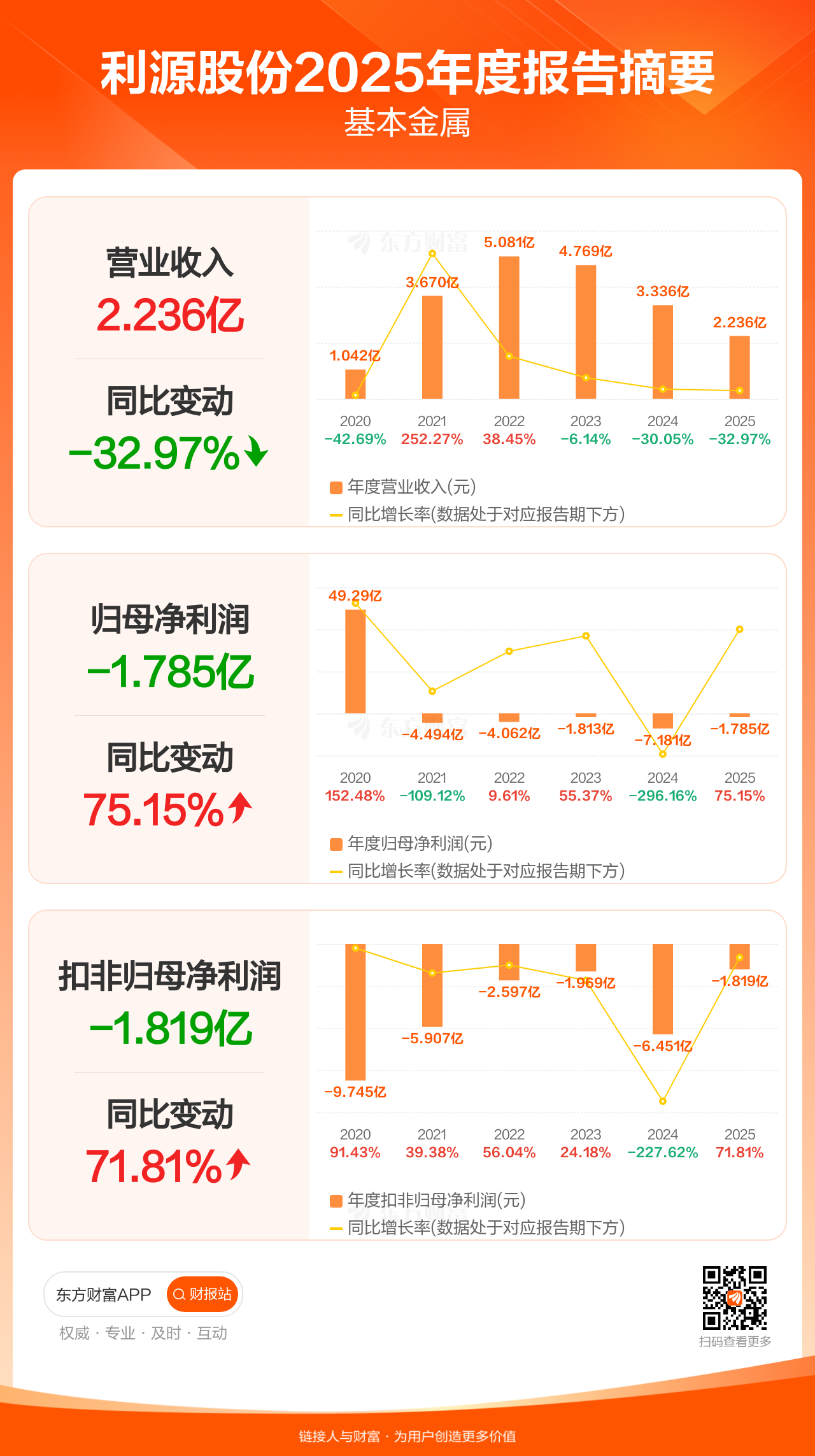 利源股份4月29日发布2025年年报显示,公司全年实现营业收入2.24亿元,同比下滑32.97%;归母净利润-1.78亿元;扣非归母净利润-1.82亿元。