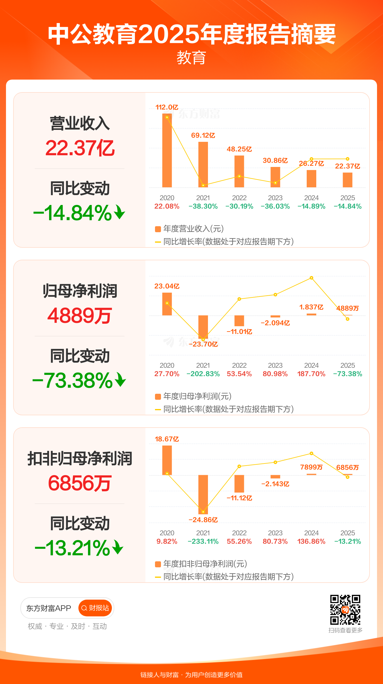 中公教育4月29日发布2025年年报显示,公司全年实现营业收入22.37亿元,同比下滑14.84%;归母净利润4889.14万元,同比下滑73.38%;扣非归母净利润6855.70万元,同比下滑13.21%。
