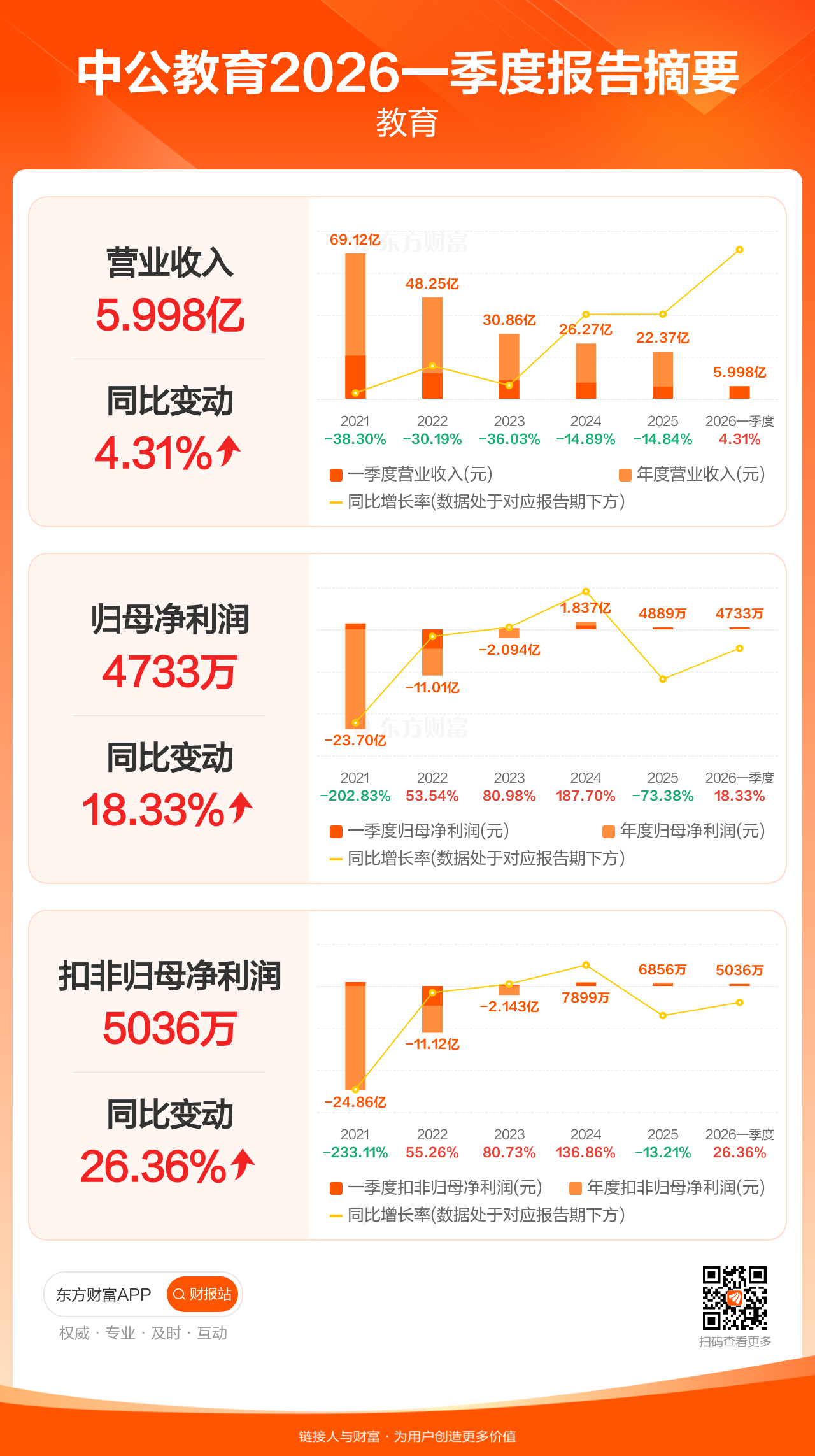 中公教育4月29日发布2026年一季报显示,公司一季度实现营业收入6.00亿元,同比增长4.31%;归母净利润4732.63万元,同比增长18.33%;扣非归母净利润5035.98万元,同比增长26.36%。