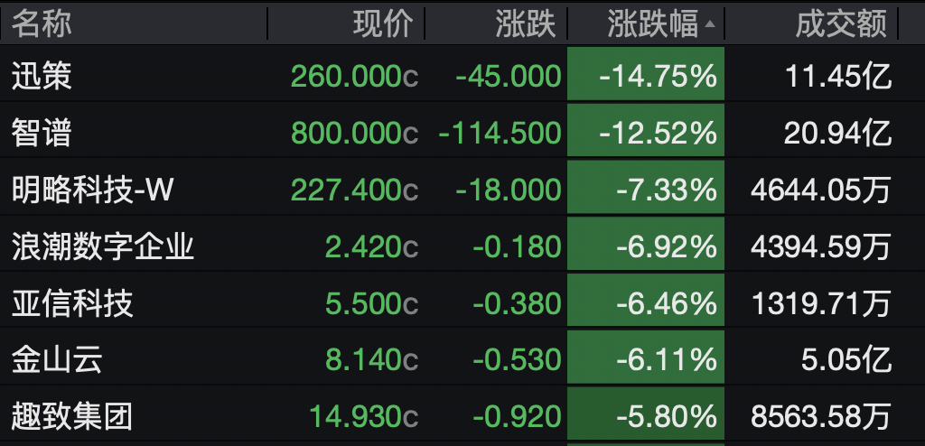 AI应用龙头尽数下跌,迅策、智谱均跌超10%,明略科技、浪潮数字企业和金山云均收跌。