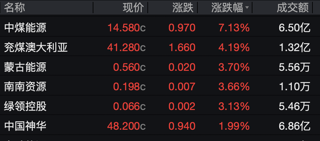 煤炭股全天活跃,中煤能源上涨7%。