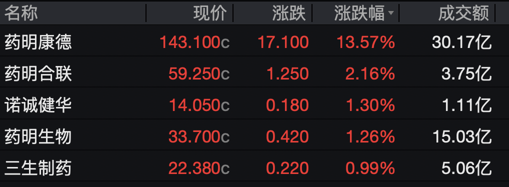医药板块今日走强,药明康德逆市大涨13.57%,药明合联、诺诚健华、药明生物等均收涨。