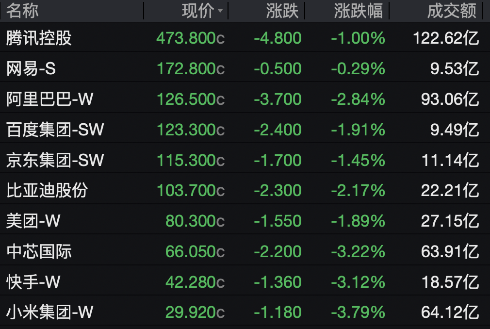 大型科技股集体低迷,小米尾盘下跌,收跌近4%,阿里巴巴跌近3%,百度、美团跌近2%,京东下跌1.45%,腾讯下跌1%。