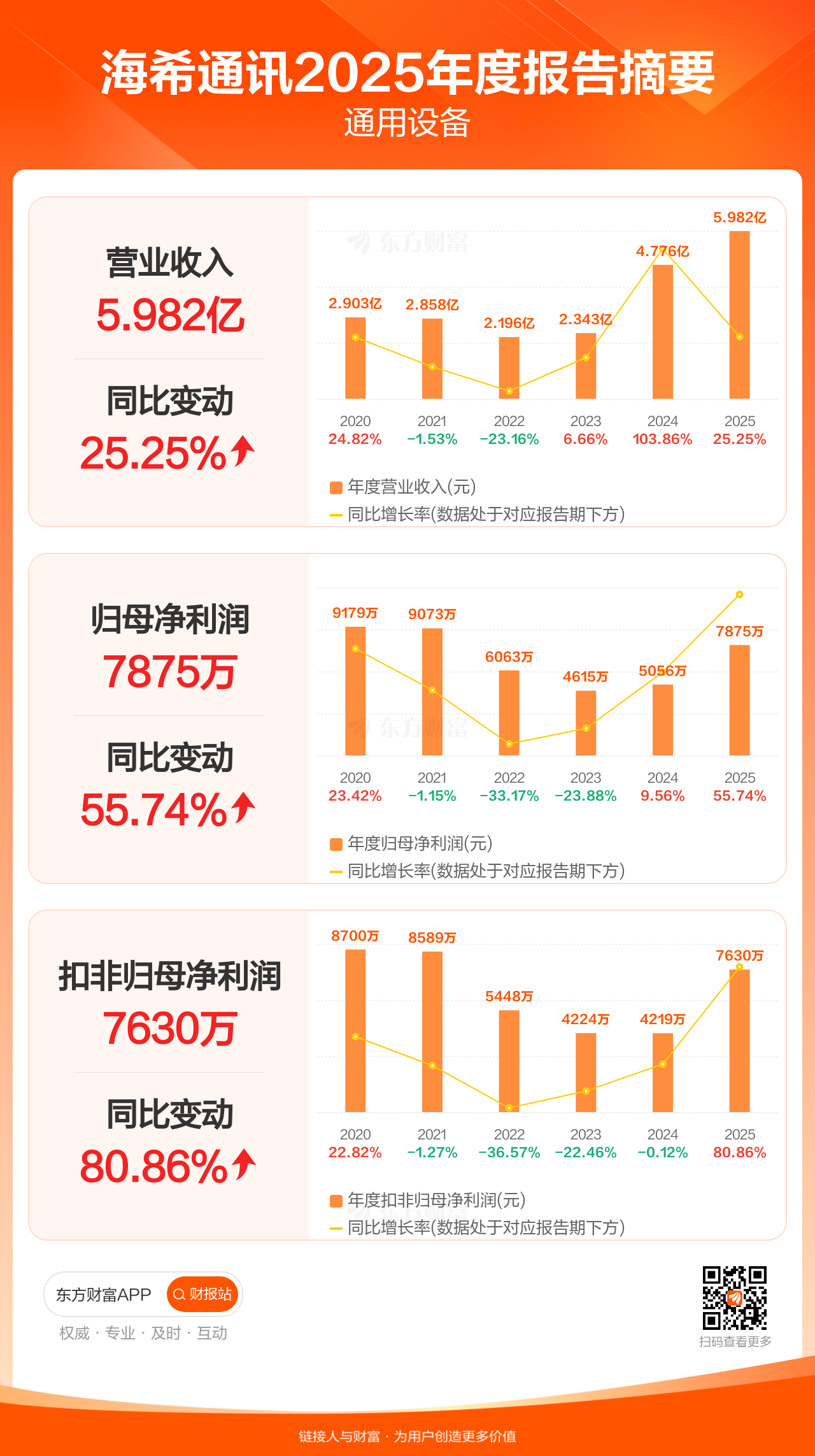 海希通讯4月28日发布2025年年报显示,公司全年实现营业收入5.98亿元,同比增长25.25%;归母净利润7874.72万元,同比增长55.74%;扣非归母净利润7630.36万元,同比增长80.86%。