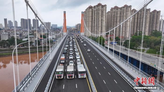新的子材大桥采用单跨地锚式叠合梁悬索桥设计,兼具实用性与观赏性。大桥主跨达270米,通航净高提升至19.3米,可满足5000吨级船舶通航需求。主桥桥面拓宽了4.5米,桥面总宽40米,单向机动车道宽度由8.5米拓宽为11.5米。