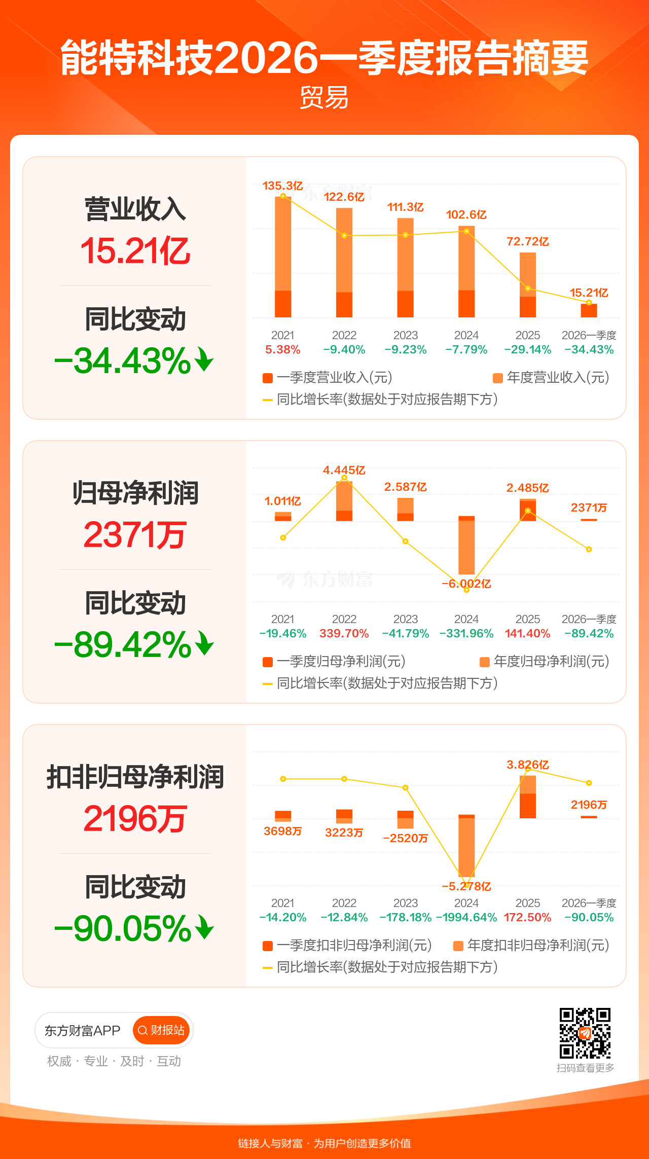 能特科技4月29日发布2026年一季报显示,公司一季度实现营业收入15.21亿元,同比下滑34.43%;归母净利润2371.05万元,同比下滑89.42%;扣非归母净利润2196.08万元,同比下滑90.05%。