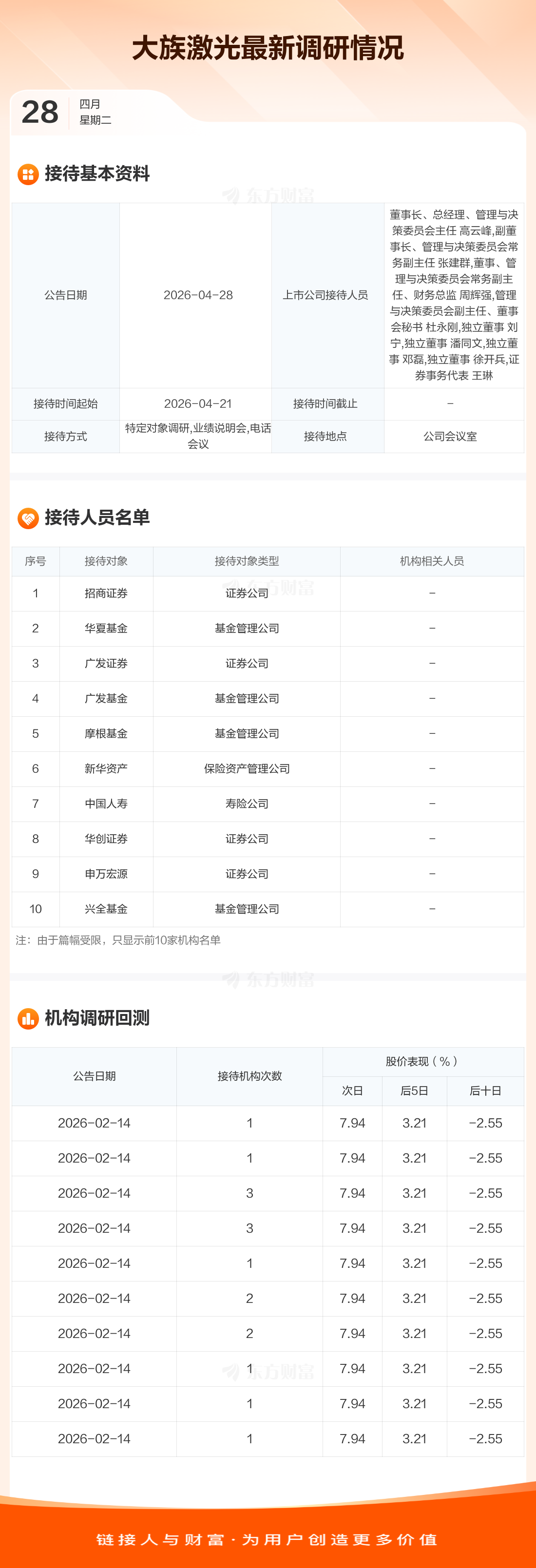 大族激光4月28日公告称,4月21日接待招商证券等12家机构调研。接待人员包括董事长、总经理、管理与决策委员会主任 高云峰,副董事长、管理与决策委员会常务副主任 张建群,董事、管理与决策委员会常务副主任、财务总监 周辉强,管理与决策委员会副主任、董事会秘书 杜永刚,独立董事 刘宁,独立董事 潘同文,独立董事 邓磊,独立董事 徐开兵,证券事务代表 王琳。
