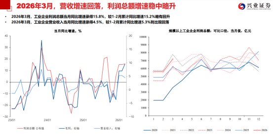 2026年1-3月工业企业利润继续保持较快增长,全国规模以上工业企业实现利润总额16960.4亿元,同比增长15.5%,系2022年以来工企盈利读数最大值,驱动原因或有三点:1)我国中游制造企业海外议价能力上升,推高营业利润率;2)“十五五”时期开局之年各地方政府及央国企生产投资意愿较强,推动销售量价齐升;3)2021年至今我国产业结构转型成效显现,高技术制造业、装备制造业利润支撑明显。