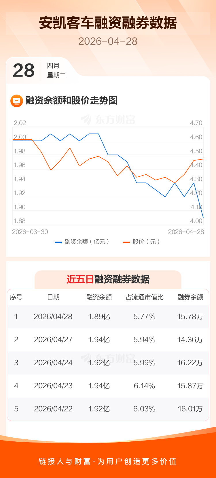 交易所最新数据显示,安凯客车于2026年4月28日获融资买入339.41万元,融资偿还878.67万元,当日融资净偿还539.26万元。目前,该股融资余额1.89亿,占流通市值比例为5.77%。