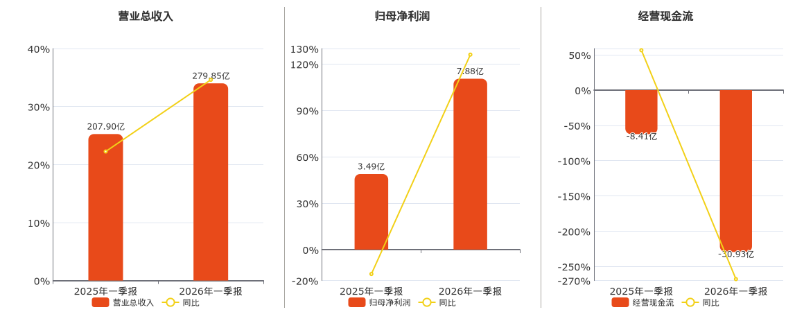 公司营业总收入为279.85亿元。归母净利润为7.88亿元。经营活动现金净流入为-30.93亿元,在已披露的同业公司中排名第102,较去年同报告期经营活动现金净流入减少22.52亿元。
