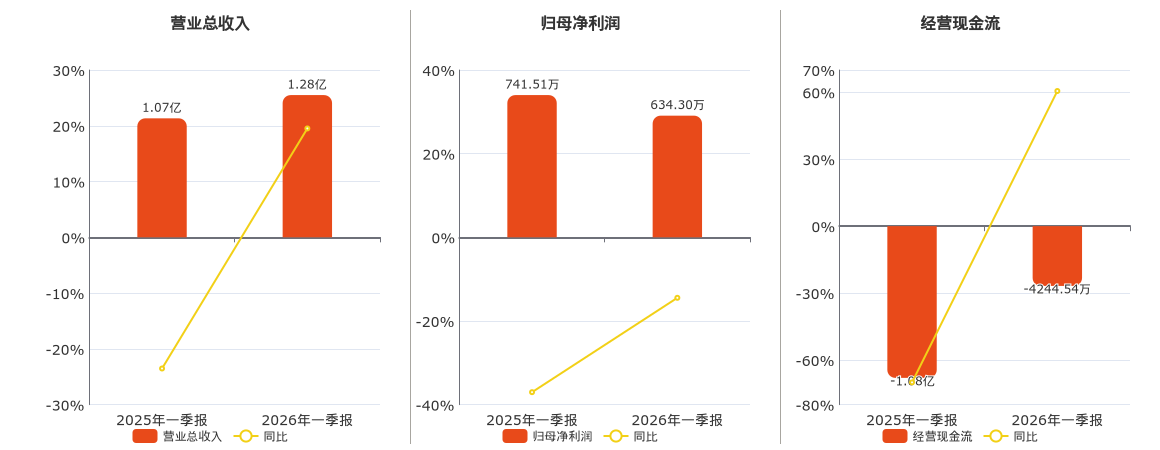 公司营业总收入为1.28亿元,在已披露的同业公司中排名第102,较去年同报告期营业总收入增加2097.51万元,同比较去年同期上涨19.52%。归母净利润为634.30万元,在已披露的同业公司中排名第97,较去年同报告期归母净利润减少107.22万元,同比较去年同期下降14.46%。经营活动现金净流入为-4244.54万元,在已披露的同业公司中排名第106,较去年同报告期经营活动现金净流入增加6523.31万元。
