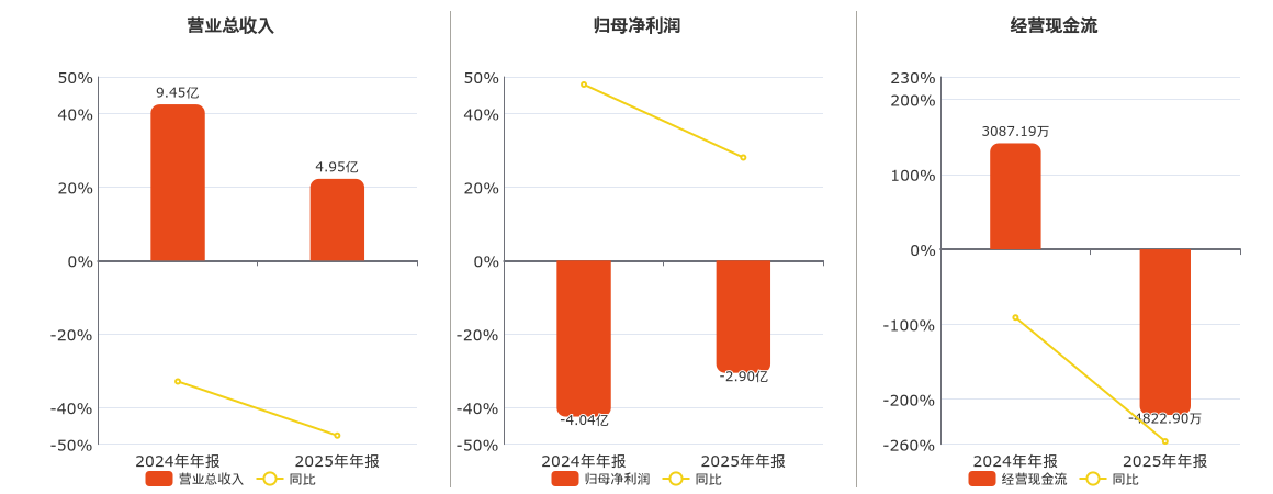公司营业总收入为4.95亿元。归母净利润为-2.90亿元,较去年同报告期归母净利润增加1.13亿元,实现4年连续上涨。经营活动现金净流入为-4822.90万元。