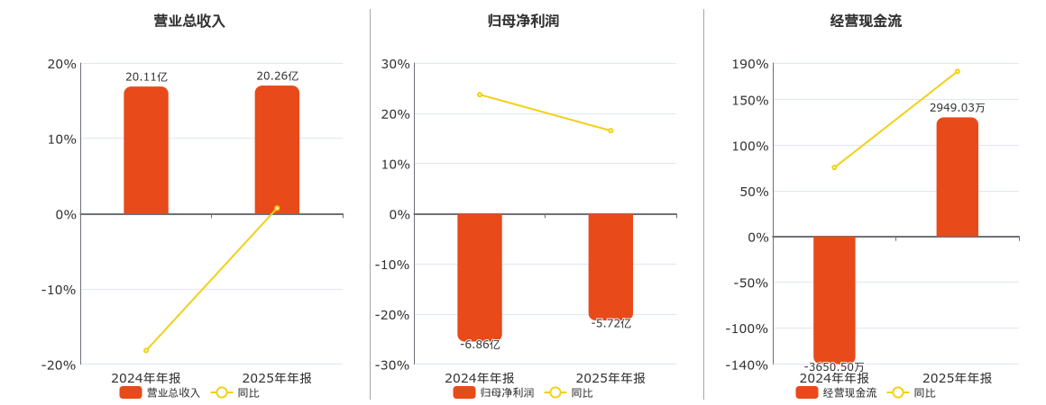 公司营业总收入为20.26亿元。归母净利润为-5.72亿元,在已披露的同业公司中排名第118。经营活动现金净流入为2949.03万元,在已披露的同业公司中排名第73。