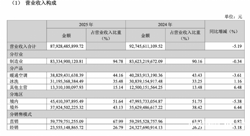 分业务板块看,暖通空调业务成为业绩的最大拖累。2025年,该板块营收388.29亿元,同比下降3.61%,其中负责中央空调业务的海信日立受国内房地产市场低迷、公建项目缩减影响,全年收入173.91亿元,同比大幅下降16.2%。尽管海信日立在多联机市场份额仍超23%,持续领跑行业,但份额领先并未转化为利润优势,以价换量的经营模式导致利润承压。