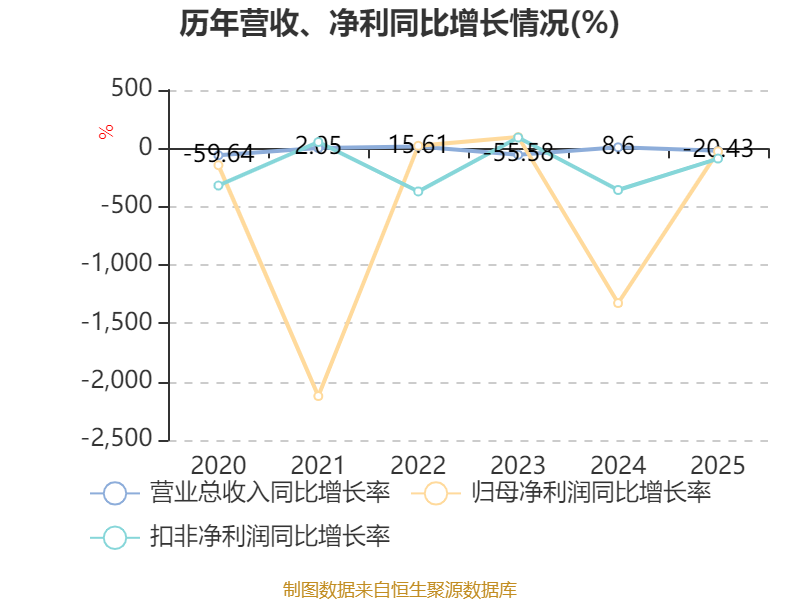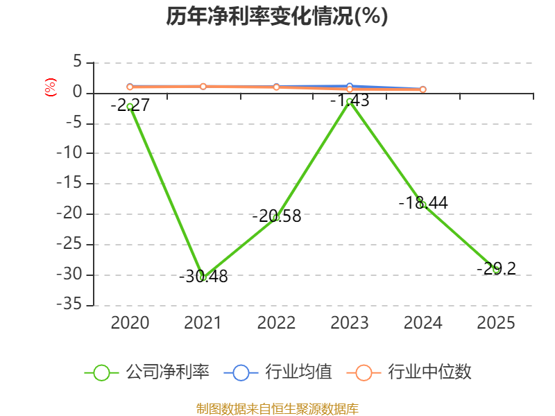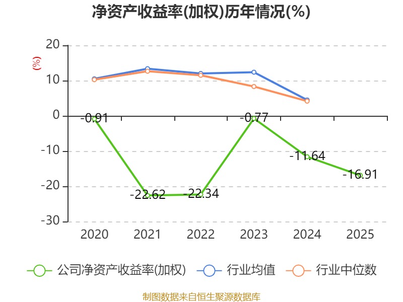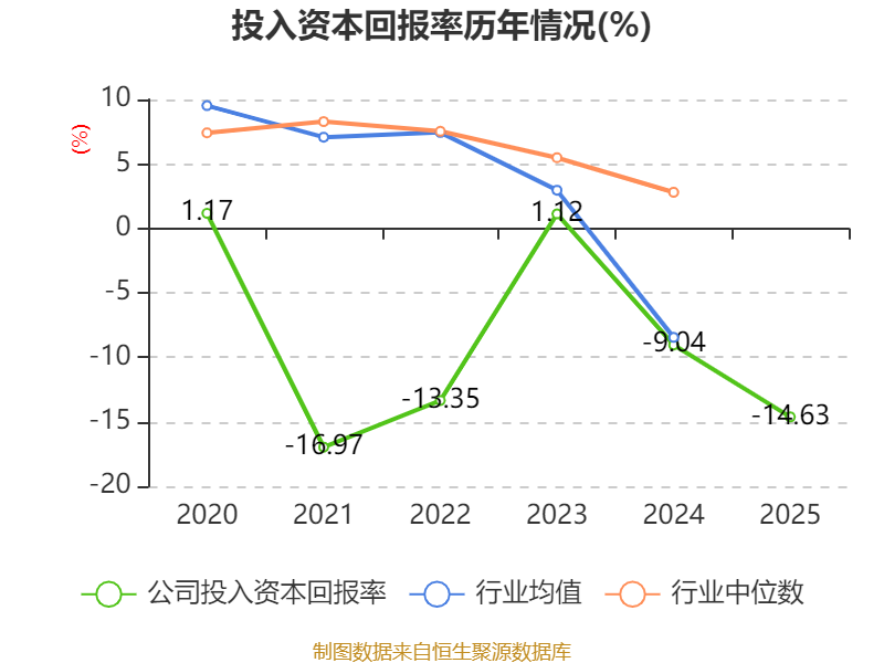 数据显示,2025年公司加权平均净资产收益率为-16.91%,较上年同期下降5.27个百分点。公司2025年投入资本回报率为-14.63%,较上年同期下降5.59个百分点。