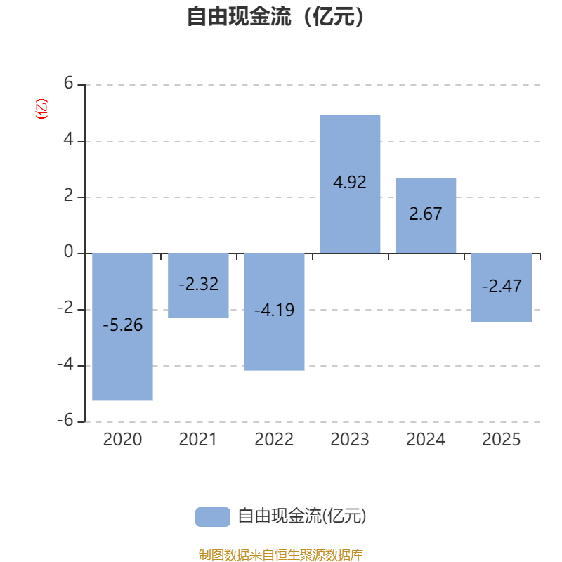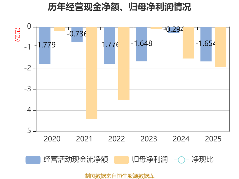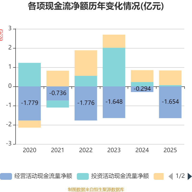 截至2025年,公司经营活动现金流净额为-1.65亿元,同比减少1.36亿元;筹资活动现金流净额7637.17万元,同比增加1446.06万元;投资活动现金流净额671.63万元,上年同期为2262.31万元。