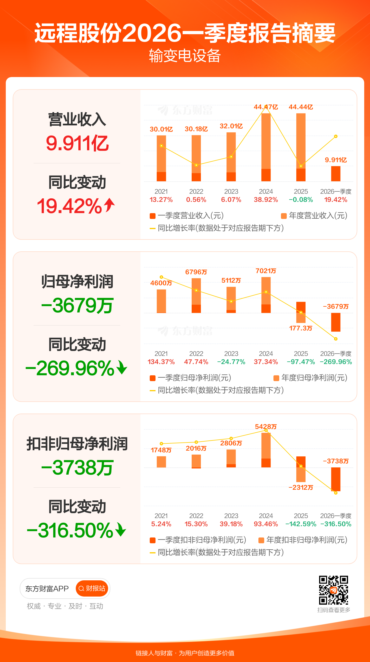 远程股份4月30日发布2026年一季报显示,公司一季度实现营业收入9.91亿元,同比增长19.42%;归母净利润-3678.81万元;扣非归母净利润-3737.65万元。