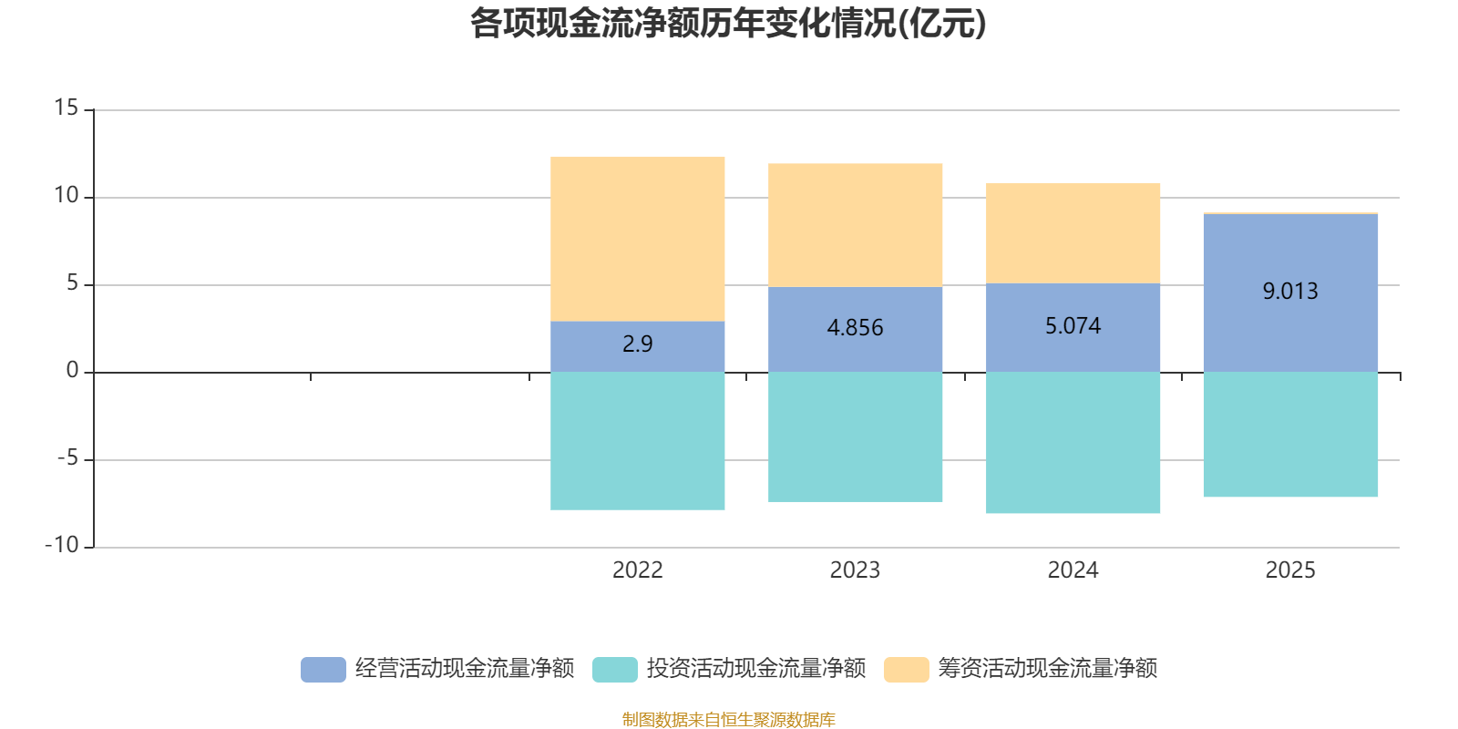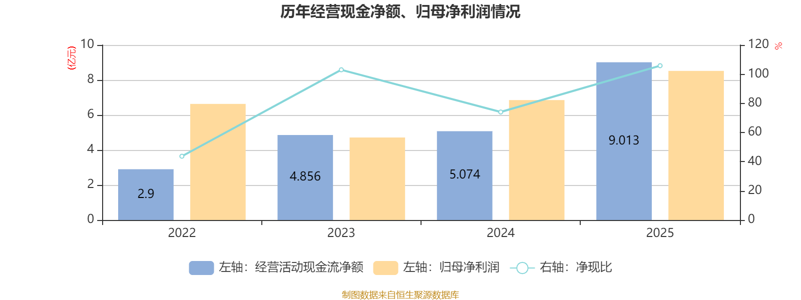 2025年,公司经营活动现金流净额为9.01亿元,同比增长77.64%;筹资活动现金流净额924.1万元,同比减少5.61亿元;投资活动现金流净额-7.15亿元,上年同期为-8.09亿元。