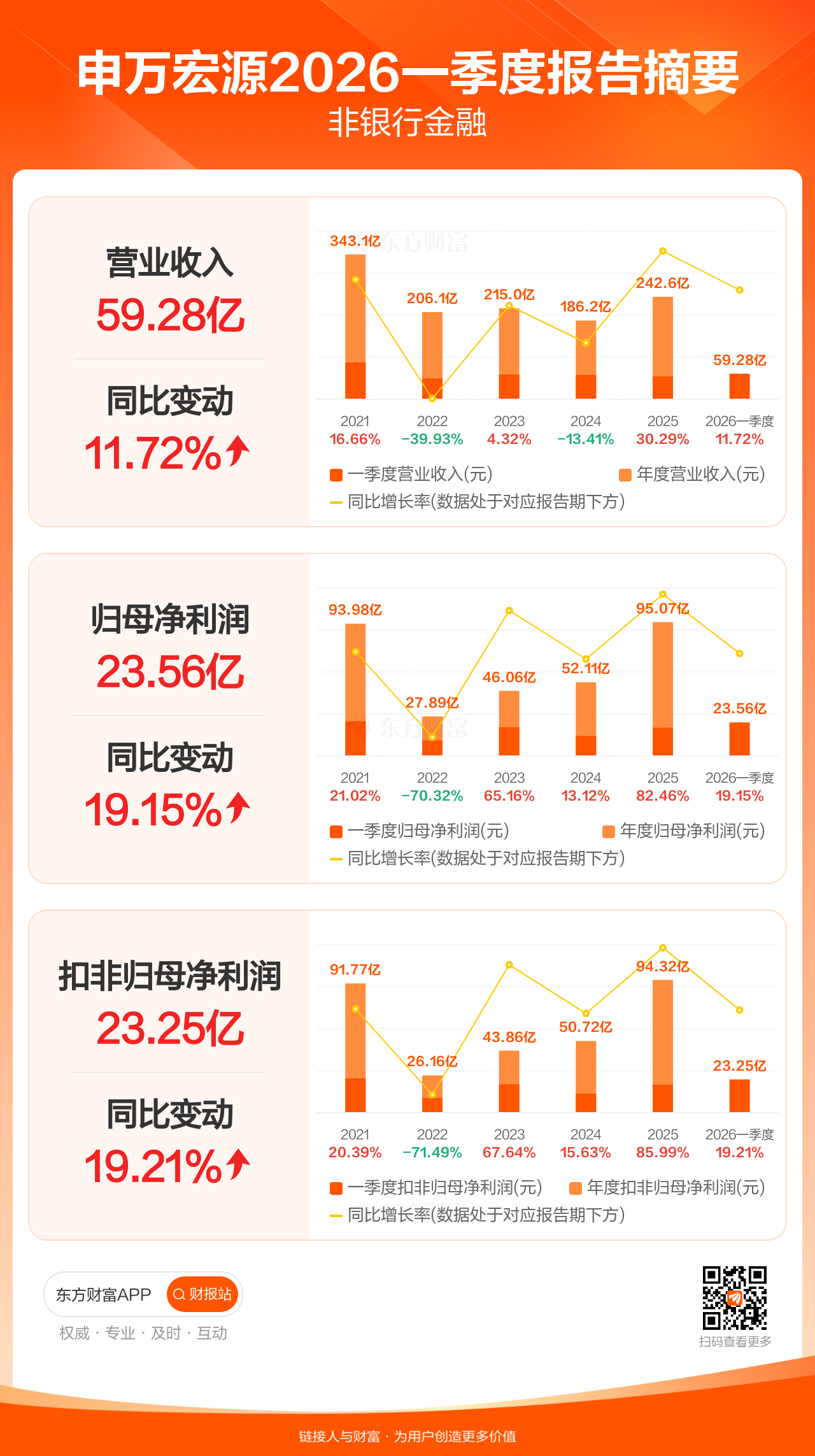 申万宏源4月30日发布2026年一季报显示,公司一季度实现营业收入59.28亿元,同比增长11.72%;归母净利润23.56亿元,同比增长19.15%;扣非归母净利润23.25亿元,同比增长19.21%。
