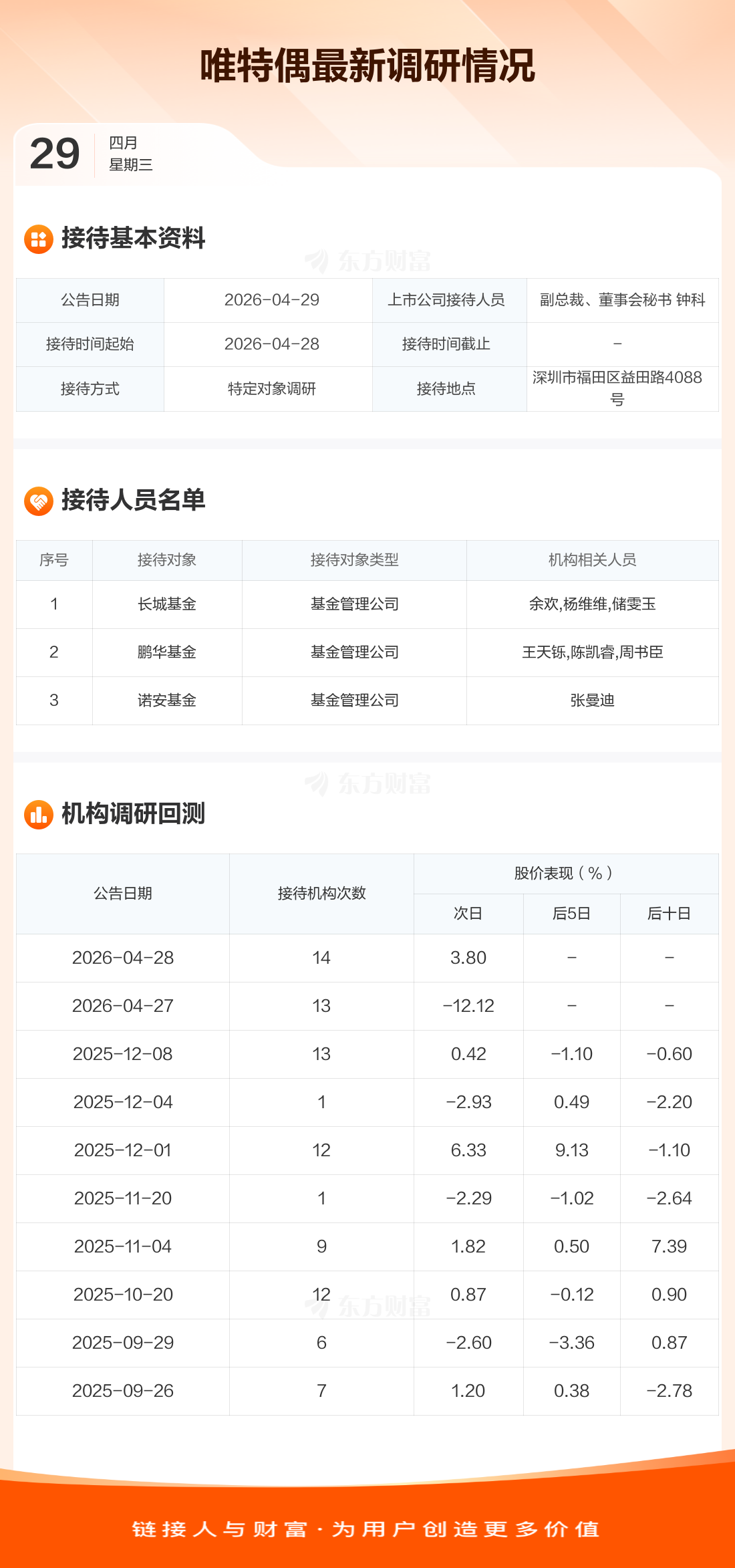 唯特偶4月29日公告称,4月28日接待长城基金等3家机构调研。接待人员包括副总裁、董事会秘书 钟科。