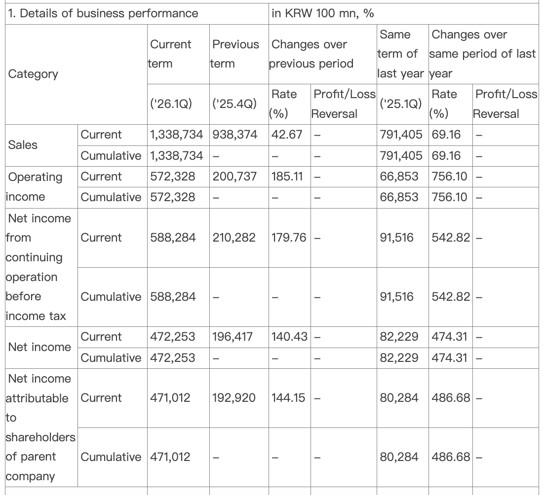 三星电子30日披露第一季度业绩,三星电子第一季度销售额133.87万亿韩元,同比增长69.16%;营业利润57.23万亿韩元,同比增长756.10%;净利润47.10万亿韩元,同比增长486.68%,市场预估为38.29万亿韩元。