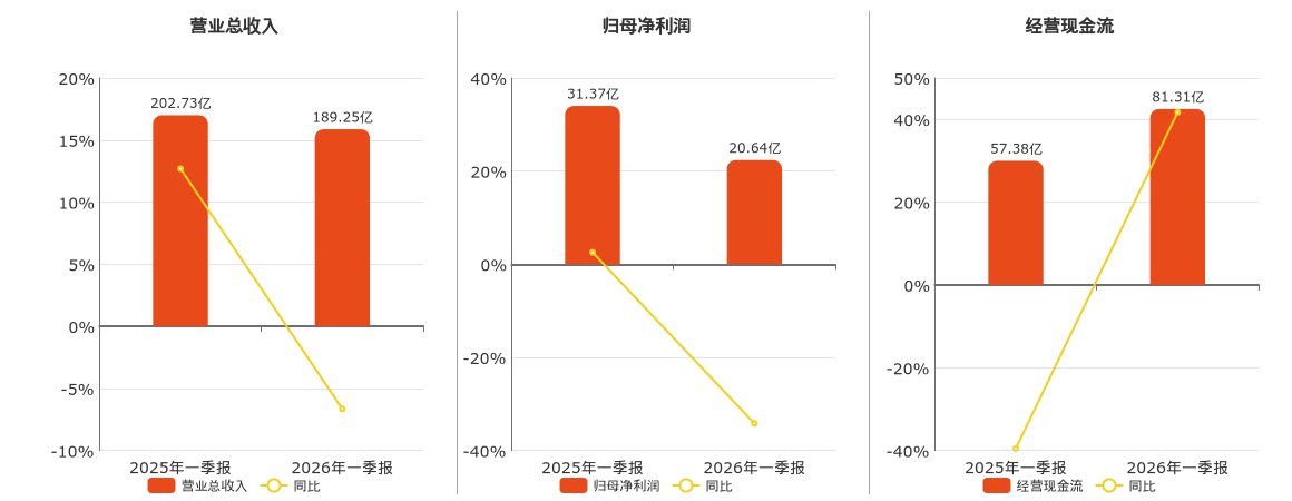公司营业总收入为189.25亿元,在已披露的同业公司中排名第5,较去年同报告期营业总收入减少13.48亿元,同比较去年同期下降6.65%。归母净利润为20.64亿元,在已披露的同业公司中排名第6,较去年同报告期归母净利润减少10.73亿元,同比较去年同期下降34.19%。经营活动现金净流入为81.31亿元,在已披露的同业公司中排名第5,较去年同报告期经营活动现金净流入增加23.93亿元,同比较去年同期上涨41.71%。