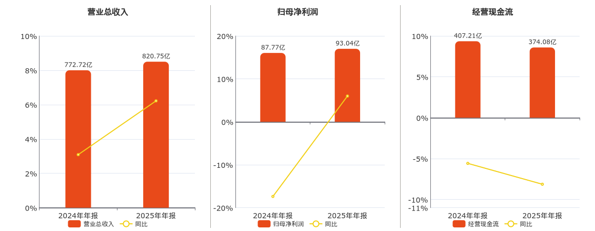 公司营业总收入为820.75亿元,在已披露的同业公司中排名第6,较去年同报告期营业总收入增加48.03亿元,实现5年连续上涨,同比较去年同期上涨6.22%。归母净利润为93.04亿元,在已披露的同业公司中排名第4,较去年同报告期归母净利润增加5.27亿元,同比较去年同期上涨6.00%。经营活动现金净流入为374.08亿元,在已披露的同业公司中排名第5。