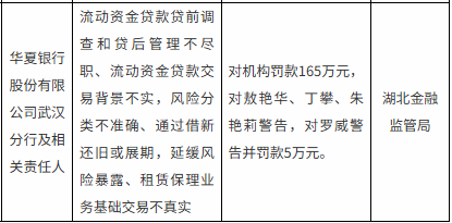 【大河财立方消息】4月30日,国家金融监督管理总局湖北监管局披露的行政处罚信息显示,因流动资金贷款贷前调查和贷后管理不尽职、流动资金贷款交易背景不实,风险分类不准确、通过借新还旧或展期,延缓风险暴露、租赁保理业务基础交易不真实,华夏银行武汉分行被罚165万元,相关责任人敖艳华、丁攀、朱艳莉被警告,罗威被警告并罚款5万元。