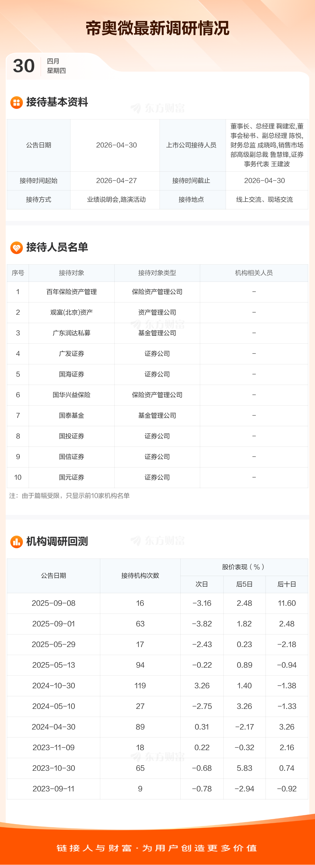 帝奥微4月30日公告称,4月27日至4月30日接待百年保险资产管理等76家机构调研。接待人员包括董事长、总经理 鞠建宏,董事会秘书、副总经理 陈悦,财务总监 成晓鸣,销售市场部高级副总裁 鲁慧锋,证券事务代表 王建波。