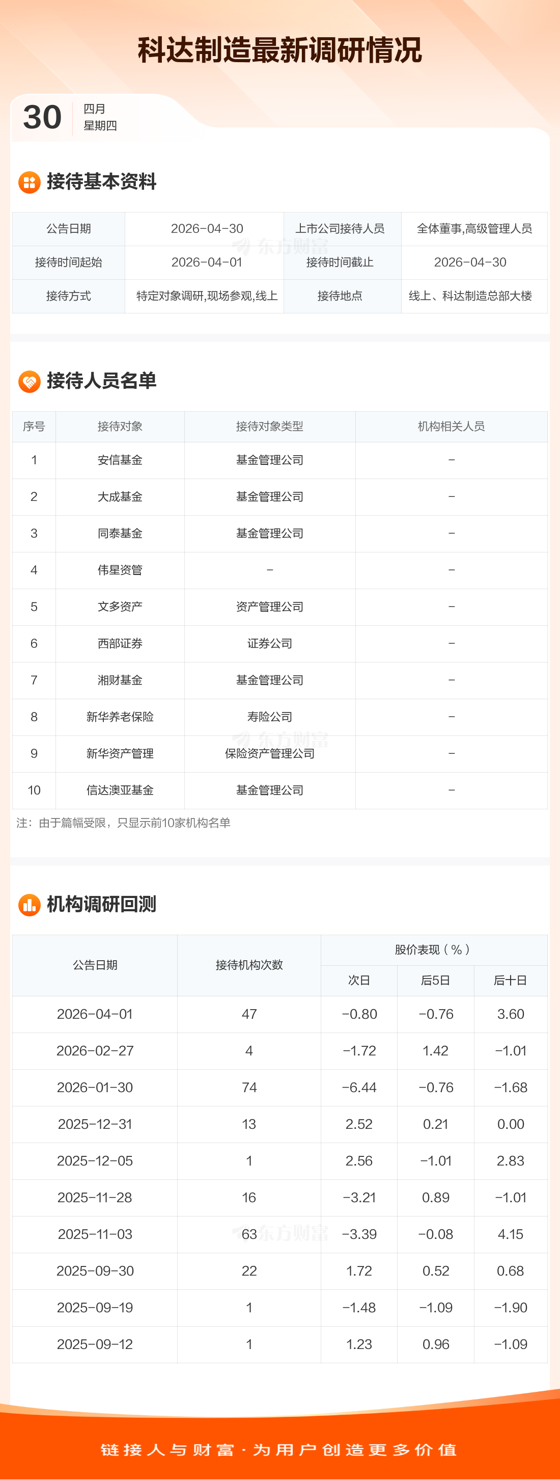 科达制造4月30日公告称,4月1日至4月30日接待安信基金等136家机构调研。接待人员包括全体董事,高级管理人员。