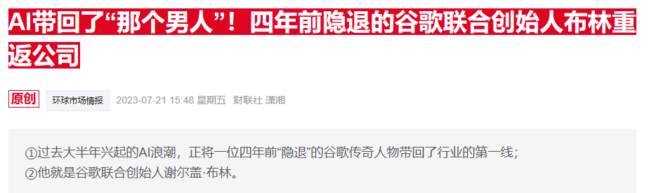 财联社报道提到,在2023年年中时,已“隐退”四年的谷歌联合创始人谢尔盖·布林(Sergey Brin)重返公司,投身人工智能相关的研发工作。